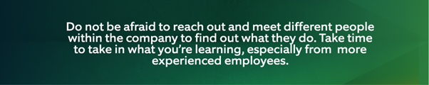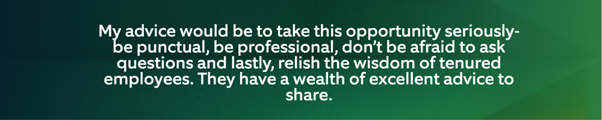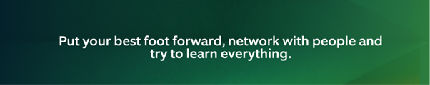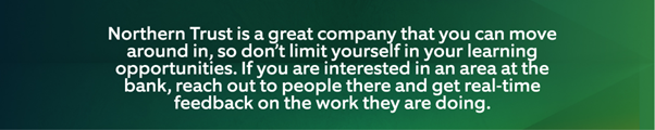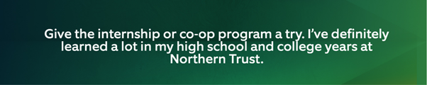 With that in mind, we asked past internship/co-op students who have continued on after their internships and grown their careers at Northern Trust for their advice and career tips for long term development and career success. They are eager to share their knowledge and top tips with the next generation of internship/co-op students.
